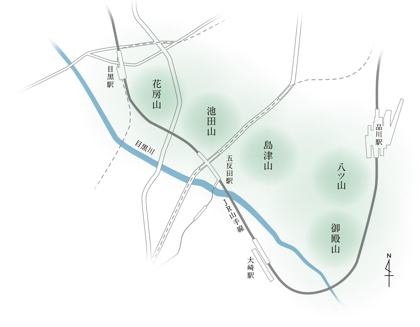 ※掲載の城南五山概念図は現地周辺の地図等をもとに書き起こしたもので実際とは道路の形状、建物の位置関係、サイズ、距離等は異なります。また、周辺環境は将来に渡って保証されるものではありません。